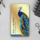 Elegante carta de negocios con temática de pavo real con un hermoso pavo real con plumas vívidas y tipografía moderna sobre un falso fondo de Relieve metalizado dorado. Añade tu nombre y datos de contacto para hacer una primera impresión duradera.