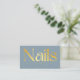 Promueva su salón de uñas o servicios de belleza con este elegante y moderno diseño de tarjetas de visita. Con un fondo azul polvoriento de moda, una tipografía de estilo dorado y un diseño minimalista, esta tarjeta es perfecta para pintores de uñas, salones de belleza o esteticistas que quieren dejar una impresión duradera. Personalice con su nombre, título y datos de contacto para que coincidan con la identidad de su marca