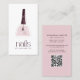 Elegante y minimalista tarjeta de visita de técnico de uñas de Rubor. El diseño incluye botellas de esmalte de uñas en rosa negro de moda, escritura tipográfica ''uñas'' y tu nombre en la parte delantera. Personalice más con sus datos de contacto y código qr en la parte posterior.