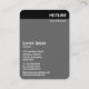 Una plantilla vertical de tarjeta de visita con un encabezado negro con una imagen en el frente. Nombre de la empresa en el encabezado de la parte delantera y posterior con todos los demás datos de contacto de la parte posterior. La foto o imagen en el frente también puede ser cambiada. El diseño también permite una gran personalización.