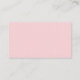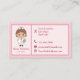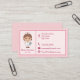 Tarjeta de presentación para una enfermera o trabajadora de cuidados. A la izquierda hay una imagen de una enfermera de dibujos animados con una tablilla. Debajo de la enfermera hay plantillas en letra rosa para su nombre y cargo. A la derecha hay plantillas para sus datos comerciales. La parte posterior de la tarjeta es rosa con puntos brillantes.