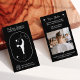 Color blanco moderno sobre el gradiente negro oscuro con estrellas, formas geométricas y silueta de yoga pose Tarjeta de negocios de profesor de estudio de instructor de yoga. Añade tu foto, logotipo, medios sociales, dirección y horario.