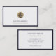 Destacar con estas tarjetas de visita de alta calidad que presentan un emblema de oro llamativo con escalas de justicia en un fondo blanco limpio, enmarcado en una rica frontera azul marino. Ideal para abogados y servicios legales para establecer redes e introducir su identidad profesional.