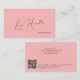 Elegante y moderno guión de caligrafía escrita a mano nombre de tarjeta comercial rosa y negra genérica con escaneo de código QR en sitio web, catálogo o portafolio. Adecuado para los profesionales de la belleza: maquilladores, peluqueros, técnicos de uñas, especialistas en azotes y cejas, influyentes, estilistas personales o blogueros de estilo de vida.