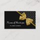 Elegantes tarjetas de negocios con encanto de oro y negro con modernos puntos de polka en blanco y negro y una elegante cinta dorada atada a un arco de moda. Estas tarjetas de visita de calidad, aunque asequibles, atraen a nuevos clientes y clientes a su salón de belleza profesional. Imagen plana impresa, no arco real.