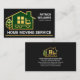 Una cubierta gris oscura muestra una creativa creación en movimiento de un "camión de la casa" de oro. Hacia la esquina superior derecha está tu prestigioso nombre y título de trabajo. El nombre de la empresa se encuentra cerca de la base de la tarjeta. Al dorso, el logotipo dorado "home-truck" que puedes usar está en la parte superior. A esto le sigue su prestigioso nombre, los detalles de contacto y una opción de slogan para promocionar sus servicios. Una cubierta creativa para los temas del transporte de camiones para el hogar.