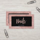 Estas elegantes tarjetas de visita para técnicos de uñas presentan un aspecto falso rosa de purpurina dorado (por favor, tenga en cuenta que no es un purpurina real, sino una imagen de purpurina) y un marco de centro negro con un guión moderno escrito a mano que dice "uñas".