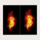 Una brillante pluma de pavo real hecha de fuego y llama sobre fondo negro.