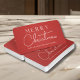 Una tarjeta única para expresar gratitud a sus clientes por su asistencia. Feliz Navidad en una tipografía de escritura con una tarjeta roja vibrante. Personalice el lado inverso con los detalles y el logotipo de su empresa
