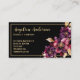 Elegante y lujosa tarjeta de visita Purple Golden Floral Black. La parte delantera y la trasera están enmarcadas por un marco dorado y letras doradas. Personalizar tu nombre en un guión dorado y opcional para cambiar el texto y el título. 3 flores y hojas en morado y oro sobre un fondo negro y sofisticado cubren la parte superior de la tarjeta. La parte posterior tiene lo esencial en el lado izquierdo como: nombre, título, lema o nombre de la empresa, dirección, teléfono, web y correo. El lado derecho esconde las flores moradas y doradas. Un marco dorado lo termina. Esta tarjeta de visita es sofisticada y lujosa, con el oro sobre negro con flores profundas rojas y violetas, ideal para una florista, planificadora de eventos o para un comercio diferente.