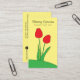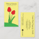Una moderna tarjeta de visita que exhibe un ilustracion original de Mango Moon Studio con dos llamativos tulipanes rojos sobre un alegre fondo amarillo en el césped, creando una obra maestra visual que captura con gusto el espíritu de tu tienda florista. Añade el nombre, el lema, las horas y los datos de contacto de tu tienda de florística.