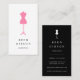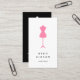 Elegantes tarjetas verticales de negocios para costureros, diseñadores de moda, estilistas, sastres y más presentan una forma de vestir de rosa vibrante con dos líneas de texto personalizado en negro crujiente. Personalizar la parte posterior con los detalles de contacto completos, que se muestran debajo de un ilustracion de color blanco sobre negro con un vestido más pequeño.