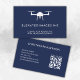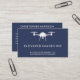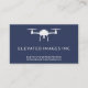 Una tarjeta de visita mínima adecuada para un fotógrafo piloto de drones aéreos. El diseño es moderno y elegante y cuenta con un logotipo de drones blancos en la parte delantera, con un fondo marino y un espacio para su nombre de negocio y su lema. En la parte posterior de su nombre, información de contacto y un código QR. Los clientes podrán ir fácilmente a su sitio web para ver sus imágenes.