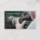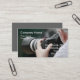 Tarjeta de presentación para fotógrafos con foto de una persona que sostiene una lente de cámara muy grande y una cámara usualmente usada por un fotógrafo profesional. Tarjeta de visita diseñada para fotógrafos, camarógrafos, organizadores de eventos o bodas.