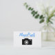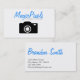 Un diseño sencillo y moderno con el nombre de tu empresa en un color azul cielo con un tipo de letra de guión y una breve descripción de tus servicios escondidos bajo un color gris claro y un bonito gráfico moderno de una cámara todo colocado sobre un fondo blanco limpio. Coloca la información de contacto en el reverso en fuentes y colores coincidentes. Se trata de una tarjeta de visita muy moderna y profesional que puede funcionar para muchas profesiones.