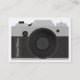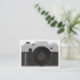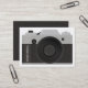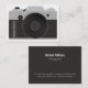 Una tarjeta de visita de gran tamaño con una cámara que llena encima la mayor parte del frente de la tarjeta del espacio en la izquierda para la personalización del nombre. En la parte posterior es un fondo gris oscuro de la textura. Paleta de colores con clase del gris, blanco y negro. Perfeccione para los fotógrafos.