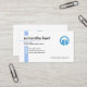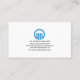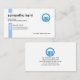 La tapa presenta dos conjuntos de líneas de columna azul claro. La primera es una delgada línea cerca de la parte superior que tiene su prestigioso nombre con el título de su trabajo y el nombre de su negocio debajo. Un logotipo global para su uso está en el extremo derecho opuesto. La columna azul vertical de la pared izquierda contiene los detalles de contacto. Hacia la base es una opción slogan para publicitar sus servicios.