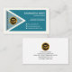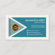 La tarjeta presenta un diseño de triángulo y polígono en color cian. En la parte superior está tu prestigioso nombre y cargo junto a una opción de lema cerca del centro. Hacia la base están los datos de contacto alojados por botones triangulares. Un logotipo dorado y su nombre comercial se unen al triángulo de la cara izquierda.