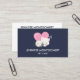 Una tarjeta de visita con un adorable ilustracion gráfico. Un gato blanco gatito con una linda imagen impresa en su piel. Dormir pacíficamente. Un gran corazón rosado detrás de ella y algunas pequeñas estrellas también. Fondo azul oscuro.
