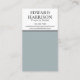 Esta tarjeta minimalista hace una declaración en negrita. El diseño vertical geométrico es sencillo y tiene un fondo gris de un color azul claro con una banda de blanco a lo largo del borde superior. La parte frontal incluye sus iniciales, mientras que la parte inversa incluye su nombre, título y toda la información de contacto, incluyendo teléfono, correo electrónico y dirección web. La tipografía gris oscuro es moderna y limpia frente a la banda blanca