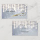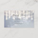 Una elegante tarjeta de negocios estilo peluquero plateado adornada con lámparas de araña colgantes y luces de cuerda brillante tenía un par de tijeras para cortar el pelo. Personalice agregando su nombre, credenciales, así como su peluquería.