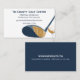These custom business cards are ready to be customized with your information on the front and the back. On the front is a spot to add your business name, an employee's name, an employee's job title, email address and phone number. On the back is a spot to add a website address and a mailing address. Text on the front is in navy blue against a white background. Text on the back is in white against a navy blue background. These business cards feature my realistic style illustration of a golf club and golf ball in shades of blue and gold making them perfect for golfing instructors, golf pros, golf centers and more.