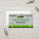 Tarjeta de negocios de servicio de césped. con una cortadora de césped verde y amarillo de vuelta cero.
