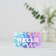 Hola en letra negrita en blanco, en un diseño abstracto asimétrico en rosa pastel, azul pálido, lavanda y amarillo, con un efecto metálico del arte gradiente.