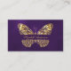 Un elegante fondo violeta profundo decorado con una mariposa de oro falso. El color púrpura es desigual. Personalice y agregue su nombre al frente. Atrás: Plantillas para su nombre, título, número de teléfono, dirección de correo y sitio web, código QR. Perfecto para empresarias, consultoras, dueñas de negocios.