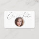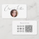 Este sencillo y profesional diseño blanco presenta una tipografía de guión elegante, una foto redonda (reemplazarla con una imagen cuadrada para los mejores resultados), muchos iconos de medios sociales y un código QR para personalizar con tu sitio web o blog. Los iconos de los medios sociales se pueden mover o borrar usando la herramienta de diseño.