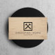 Un logotipo de martillos interrelacionados en caja enmarcada se combina con su nombre o nombre de negocio para una estética profesional en esta plantilla de tarjeta de visita diseñada para los artesanos, carpinteros, empresas de construcción, etc. Colocado en una imagen de fondo de madera para un aspecto utilitario. © 1201AM CREATIVE
