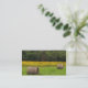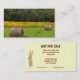 Esta tarjeta de visita publicitaria de heno para la venta presenta un hermoso paisaje otoñal. El verano se acabó y dos balas de heno se están secando en un prado verde que bordea un campo de brillante vara dorada amarilla. Luego viene el bosque. Los árboles son en su mayoría verdes, pero algunos colores otoñales de rojo y amarillo están empezando a aparecer. Todo el texto se puede personalizar para adaptarlo a sus necesidades personales de negocio.