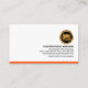 Una capa superior de color rojo oscuro tiene una azotea y herramientas de mano que se colocan en tiras verticales de color rojo claro. Las herramientas pueden representar parte del servicio que se puede ofrecer, por ejemplo, el martillo para la reparación del hogar, el pincel para la pintura y, por último, la carretilla y el tenedor del jardín para la jardinería de paisajes. Cerca de la base de la tarjeta se encuentra el nombre de la empresa, sus datos de contacto y un pie de foto para publicitar sus servicios. Puede cambiar los comentarios del pie de foto por el eslogan para que se adapte a sus propias necesidades de servicio. Al dorso, en una cubierta blanca, los detalles se encuentran en la pared derecha de la tarjeta, con el logo de un paisaje dorado que se puede usar en la parte superior. A esto le sigue su prestigioso nombre, los detalles de contacto y una opción de eslogan. Una banda naranja similar encapsula la base de la tarjeta. Esta tarjeta sería genial para la construcción, construcción y temas prácticos.