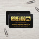 Una cubierta gris y negra de capas presenta un diseño de carteles dorados. Cada cartel puede representar un servicio que ofrece, por ejemplo, el árbol para paisajismo o jardinería, el pincel de martillo para remodelación y pintura, la bombilla para trabajos eléctricos y el grifo para plomería. Debajo del motivo dorado se encuentra tu prestigioso nombre seguido del nombre de la empresa y sus datos de contacto. Al dorso, en una cubierta negra, el logotipo dorado de "herramientas domésticas" que puedes usar está en la parte superior. A esto le sigue su prestigioso nombre, detalles de contacto y un pie de foto para publicitar su negocio. Todas las letras aquí están en oro falso. Una gran carta para los que trabajan en la construcción.