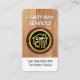 Una capa de madera cuenta con una pancarta redonda de madera cerca del centro que contiene un logotipo dorado de "herramientas domésticas" que se puede utilizar. En la parte superior está el nombre comercial "HANDYMAN SERVICES" que puede cambiar con los datos de contacto en la base, dentro de una capa blanca. En la parte superior, el logotipo dorado, en forma de cubierta blanca. Esto seguido de su prestigioso nombre y los datos de contacto. Una gran tarjeta para los artesanos, carpinteros, contratistas de construcción a usar.