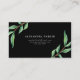 Estas tarjetas de visita elegantes ofrecen las hojas botánicas verdes de la acuarela en un fondo negro.