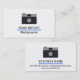 Una tarjeta de visita con el fondo blanco y un icono clásico de la cámara como diseño. Texto negro para la personalización de detalles. Una tarjeta de visita simple, profesional y moderna para los fotógrafos o negocios que tratan del equipo de la cámara.