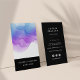 Las tarjetas de visita acuarela de moda en un formato vertical único cuentan con tu nombre o nombre de empresa en un ilustracion de manchas de tinta floreciente en tonos de azul índigo y violeta. Añade tu información de contacto completa a la parte posterior en blanco sobre negro. Incluye tres iconos de medios sociales y un campo de plantilla para tu nombre de usuario.