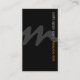 Este elegante guión en negrita agente inmobiliario de la tarjeta de negocios de inversión inmobiliaria cuenta con un gran guión en negrita de color gris oscuro en el medio de la tarjeta sobre un fondo negro. Su nombre y título aparecen verticalmente en el borde derecho de la tarjeta en blanco y naranja. Los demás datos de contacto, incluido el logotipo de su empresa, aparecen en la parte posterior de la tarjeta. La parte posterior de la tarjeta también incluye una letra monograma más pequeña en el mismo tipo de letra del guión. Perfecto para las finanzas, la inversión, la gestión, la administración, el marketing, los profesionales, los servicios empresariales, la propiedad, el inmueble, el negrita, el monograma, los temas oscuros.