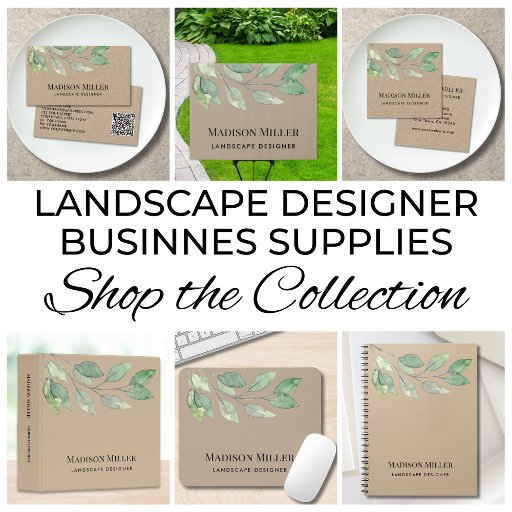 This Landscape Designer business card features watercolor greenery on kraft paper.