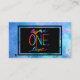 Un Personalizable vibrante tarjeta de negocios espiritual que se puede usar para diversas prácticas de negocios como Yoga, Meditación, curanderos de energía y mucho más. La parte delantera de la tarjeta muestra un fondo con temática galaxia, con un borde elegante alrededor de un tipo de letra arco iris que explica "Luz, Uno, Amor". El fondo azul nebulosa, y la fuente arcoiris "Light, One, Love" fue pintada a mano con el color del agua.