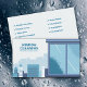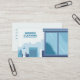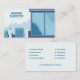 Una tarjeta de visita para servicios profesionales de limpieza de ventanas. Ilustra con una ventana con partes limpias y sucias y un fondo con un horizonte urbano que incluye edificios. En la parte trasera hay una lista de servicios con contacto completo!