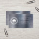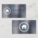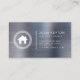 Esta tarjeta de visita inmobiliaria incluye un logo de la casa blanca enmarcado por un motivo circular griego a la izquierda y un simple sans serif blanco a la derecha, con una línea vertical entre, sobre un fondo metalizado plateado. En el reverso aparece una versión más grande del logo de la casa.