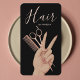 Elevate your personal brand with this luxury hairstylist business card, designed for modern beauty professionals who want to stand out with confidence and elegance. Featuring a sleek black background, soft rose-gold typography, and a stylish hand illustration holding scissors and a comb, this design perfectly reflects creativity, professionalism, and premium salon service.