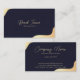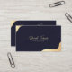 Minimalist business card design featuring a deep navy background with elegant metallic gold corner accents.