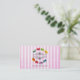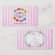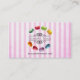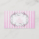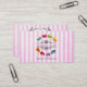 Moda patrón de tarjeta de visita con un diseño de acuarela de dulce y delicioso macarón francés en forma circular. En el centro hay un marco decorativo que dice tu nombre o negocio. El texto puede ser personalizado con su nombre, nombre comercial o lo que quiera. Los macarones están pintados con colores agradables como rosa, azul, verde limón, amarillo soleado, rojo, violeta, etc. Fijado sobre un fondo rayado rosado angustiado. Perfecto para panaderías, restaurantes, comercios caseros, panaderías, pastelería, pattiserie, etc.
