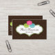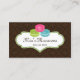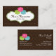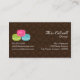 © 2014 Diseños de Socialite. Colorida tarjeta de visita de macrons lista para que usted pueda personalizar para su negocio. Los macrones están pintados en colores rosa, verde y verde azulado. El fondo de la tarjeta de visita tiene un patrón de damasco marrón. El texto de su negocio va a un elegante banner. Todos los elementos de diseño se pueden mover, rotar, cambiar de tamaño o eliminar para que se adapten a sus necesidades.