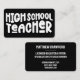 ¿Redes con clientes potenciales? Entregar nuestras tarjetas de llamadas "High School Teacher" con un diseño de tipografía blanca sobre fondo negro. Los nombres y detalles se pueden editar seleccionando "personalizar esta plantilla". Si tiene alguna pregunta o petición con respecto a este diseño, por favor contáctenos a través del chat: ¡estaríamos encantados de ayudar!