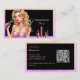 Mujer de maquillaje de pelo rubio para el negocio del cabello y maquillaje, los colores son negros y rosados. Efecto purpurina rosa y morado.