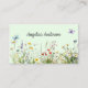 Flores y mariposas marcan la tarjeta de presentación de color de agua verde claro. La parte delantera tiene el diseño de un prado de flores silvestres con el nombre de los propietarios, el reverso tiene todo lo esencial de una tarjeta de visita; nombre, nombre/compañía, dirección, teléfono de trabajo, correo electrónico y móvil. El diseño trasero de un pequeño ramo de flores silvestres y mariposas. Nombre y texto del personalizable, y posible cambiar el tipo de letra, tamaño y color en la herramienta de diseño. Fácil de personalizar y cambiar a su nombre y detalles. Este diseño de flores silvestres acuáticas viene en diferentes productos, perfecto para usted que necesita otros suministros y quiere un diseño cohesivo en sus productos promocionales. Mezclar y hacer juego. Es impresionante y da un toque femenino a tu negocio.